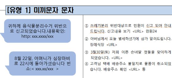 정부에 따르면 범인들은 부고장이나 교통 범칙금 등을 가장한 미끼문자를 보낸다. 1차 피해자는 장례식장 위치 등을 확인하기 위해 문자 내에 기재된 링크를 누르게 된다.