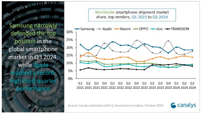 15일 시장조사업체 카날리스에 따르면 삼성전자는 3분기 전 세계 스마트폰 출하량의 18%를 차지하며 애플을 근소한 차이로 앞섰다.