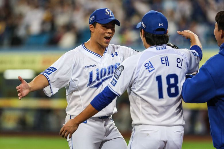 위기 상황을 막아낸 김윤수. 이닝을 마친 후 더그아웃 들어오자 팬들은 김윤수의 이름을 연호했다. 원태인도 자신의 책임주자를 모두 지워준 김윤수를 반겼다. 김윤수와 원태인은 포옹하며 기쁨을 만끽했다.