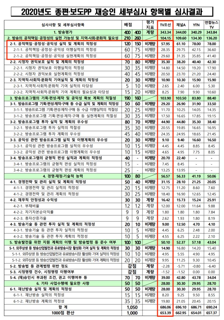 2020년 재승인 대상 방송사 심사결과. TV조선은 653.39점(빨간 세로 박스 하단)을 받았다. 650점 이상 700점 미만은 4년 재승인을 받는다. 단, 세부심사항목에서 배점의 50%에 미달할 경우 조건을 부과할 수 있다. TV조선은 방송의 공적책임 등 항목에서 120점 만점에 57.95점(빨간 가로 박스)을 받아 과락해 조건부 재승인을 받았다. 검찰은 심사위원 일부가 세부 심사 항목 점수를 조작했다고 본다. (출처: 2020년도 상반기 종합편성 및 보도전문PP 재승인 백서)