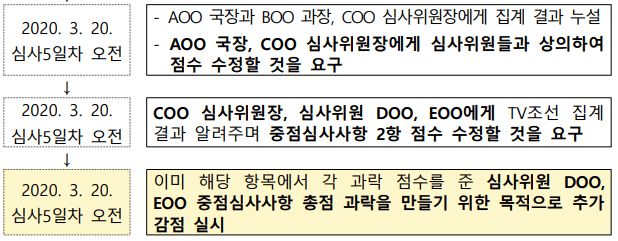 검찰은 재승인 심사위원회 의결 전인 2020년 3월 20일 열린 5일 차 회의 시작 전 오전 9시~10시 사이에 점수 수정이 이뤄졌다고 본다. 서울북부지검이 발표한 ‘TV조선 재승인 심사 점수 조작 경위’를 보면, 심사 5일 차 오전에 방통위 간부로부터 최종 점수 결과를 들은 한상혁 당시 위원장이 ‘강한 불만’을 표시했고, 이후 방통위 간부가 심사위원장에게 점수 수정을 요구했다는 것이다.