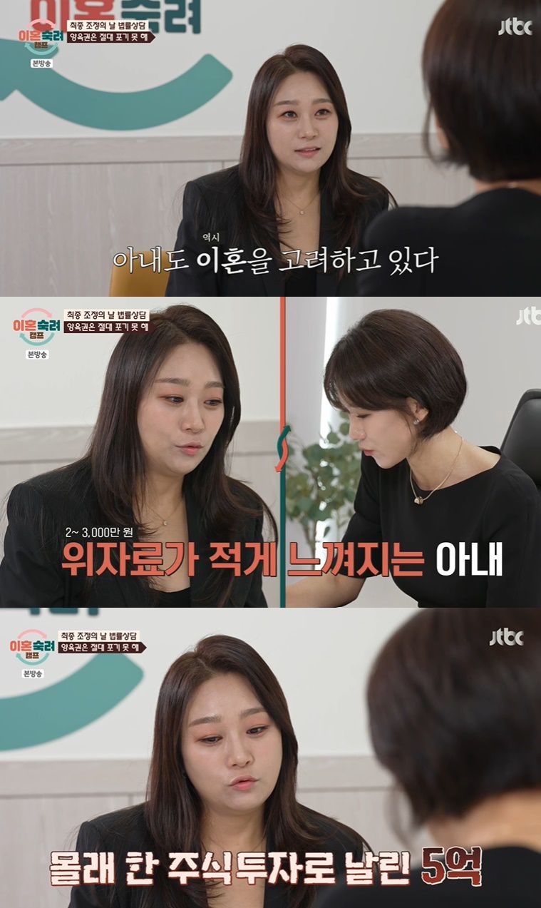 이어 아내 역시 이혼을 고려하여 위자료와 같은 문제에 대해서 상담하는 모습을 보였다. 변호사는 "아내 분이 생각하실 때 남편한테 '이러이러한 점 때문에 너무 힘들었으니까 위자료를 받아야 돼' 하는 게 어떤 거냐"고 물었고, 김경미는 "저 몰래 주식 투자해서 날린 6억이 있다. 그리고 정관 수술이 있다"며 대답했다.