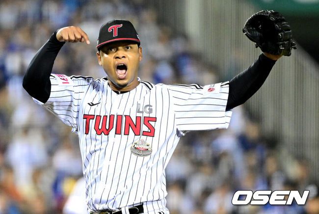 [OSEN=잠실, 최규한 기자] 프로야구 LG 트윈스가 삼성 라이온즈에 반격했다. 2연패 후 1승을 거뒀다.LG는17일 서울 잠실구장에서 열린 2024KBO리그 포스트시즌 플레이오프(5전 3선승제) 3차전에서삼성에 1-0으로 승리했다.염경엽 감독의 임찬규+에르난데스 1+1 승부수가 통했다.LG 선발 임찬규는5⅓이닝 3피안타 1볼넷 4탈삼진 무실점으로 잘 던졌다. 6회 1사 후 등판한 에르난데스가 2번째 투수로 등판해 3⅔이닝 무실점으로 승리를 지켜냈다.경기를 마무리지은 LG 에르난데스가 환호하고 있다. 2024.10.17 / dreamer@osen.co.kr
