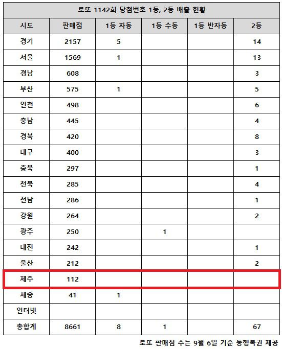 동행복권이 19일 추첨한 로또 1142회 당첨번호 조회 결과 1등은 9명, 2등은 67게임이다. 전국 17개 시도 중 제주 지역에서는 로또 고액(1,2등) 당첨 판매점이 단 한 곳도 나오지 않았다. |