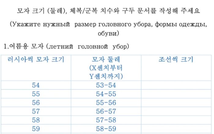 설문지에는 “모자 크기(둘레), 체복/군복 치수와 구두 문서를 작성해 주세요”라는 문구가 한국어와 러시아어로 병기됐다. 러시아와 북한의 사이즈 표기법이 다른 점을 고려해 ‘러시아씩 모자 크기’, ‘러시아씩 군복의 키 치수(키와 관련)’를 ㎝ 단위로 풀어서 설명한 점도 눈에 띈다. 러시아식 치수로 ‘2’는 ‘162-168’에 해당한다고 표기하는 식이다. ‘조선씩 크기’란은 공란으로 비워져 있다. 이처럼 사이즈를 작성하라고 안내된 항목은 ‘여름용 모자’, ‘여름용 군복 치수’ 등이다.
