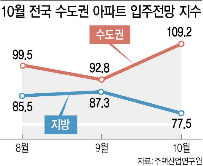 주산연이 조사한 ‘2024년 10월 주택사업경기전망지수’를 보면 수도권은 전월대비 1.3포인트 상승한 107.4, 같은 기간 비수도권은 전반적으로 하락세를 보이며 5.9포인트 하락한 76.0으로 전망됐다. ‘10월 전국 아파트 입주전망지수’ 역시 수도권은 109.2로 전월 대비 16.4포인트 상승한 반면, 광역시는 81.7, 도지역은 74.4로 각각 4.2포인트, 14.0포인트 하락했다.
