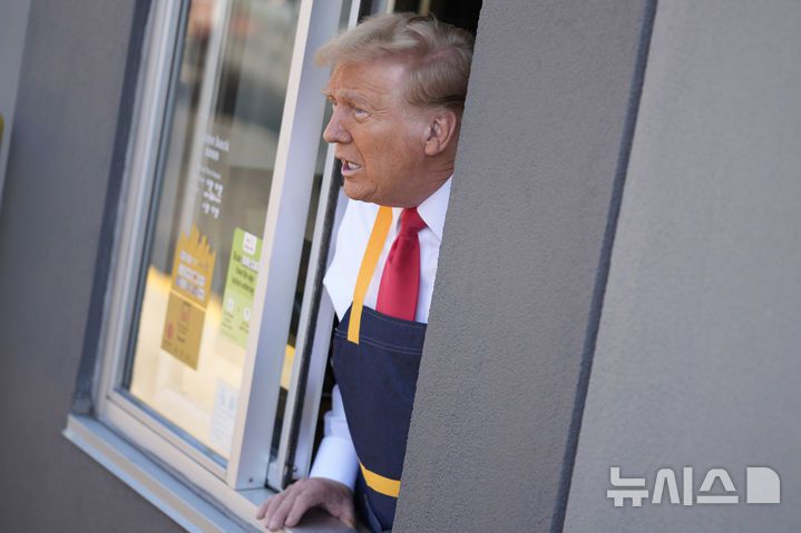 [피스터빌-트레보스=AP/뉴시스] 미국 공화당 대선후보 도널드 트럼프 전 대통령이 20일(현지시각) 펜실베이니아주 피스터빌-트레보스에 있는 맥도날드 드라이브 스루 창구에서 기자들에게 얘기하고 있다. 2024.10.21.