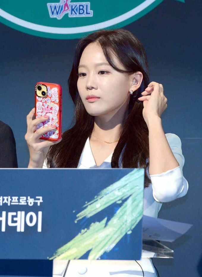 오효주 아나운서가 21일 더 플라자 호텔 서울 그랜드볼룸에서 열린 '하나은행 2024-2025 여자프로농구 개막미디어데이'에서 휴대폰거울을 보고 있다. 사진=김두홍 기자 kimdh@sportsworldi.com