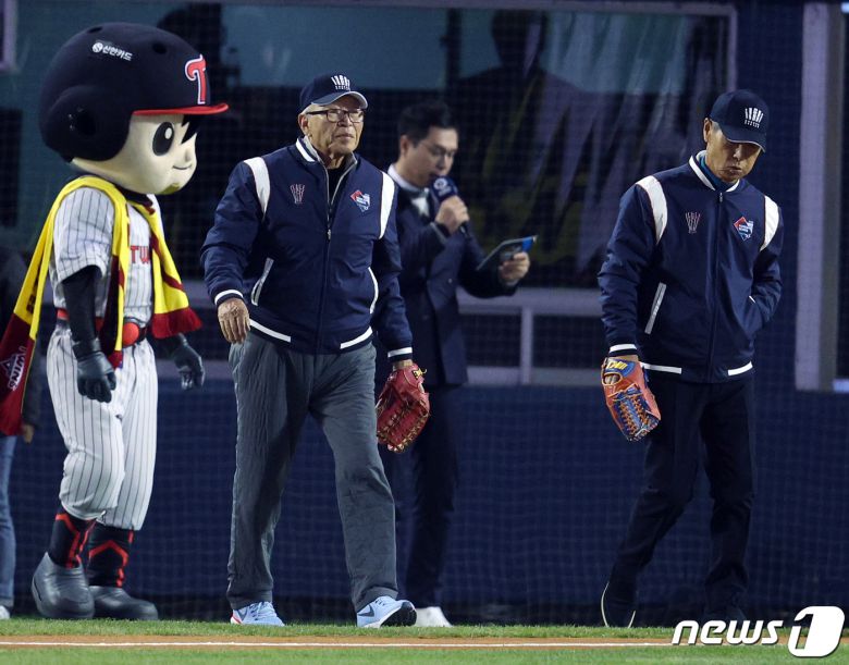 13일 오후 서울 송파구 올림픽로 잠실야구장에서 열린 프로야구 '2023 신한은행 SOL KBO 포스트시즌' 한국시리즈 5차전 LG 트윈스와 kt 위즈의 경기에 공동시구에 나선 김응용 전 감독과 김성근 전 감독이 그라운드로 나오고 있다. 2023.11.13/뉴스1 ⓒ News1 박정호 기자 |