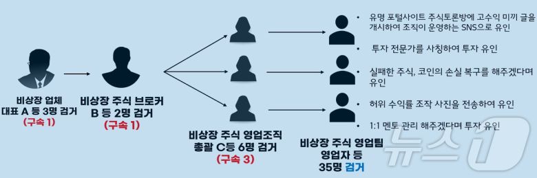 서울경찰청 광역수사단 형사기동대는 사기·부정거래·범죄단체 등 조직 혐의로 텔레마케팅 총책 5명과 비상장 회사 대표 등 46명을 입건했다고 22일 밝혔다. 텔레마케팅 영업단 사장 2명, 회사 대표, 주식 브로커 등 5명은 구속돼 9월 말쯤 송치됐다.