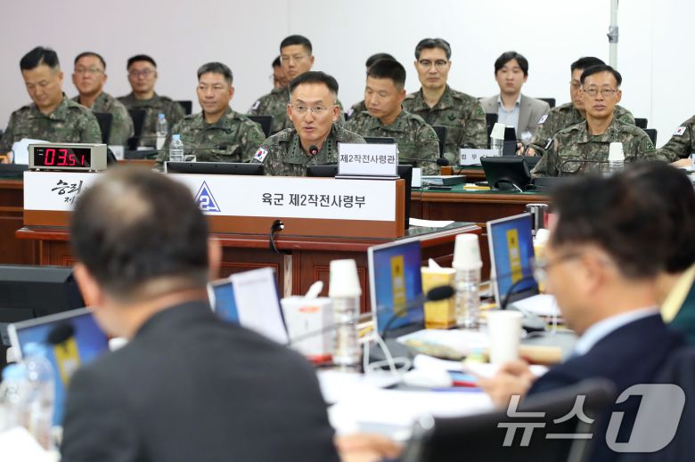 (대구=뉴스1) 공정식 기자 = 고창준 제2작전사령관(앞줄 가운데)이 22일 오전 육군 제2작전사령부에서 열린 2024년도 국회 국방위원회의 국정감사에서 질의에 답하고 있다. 2024.10.22/뉴스1