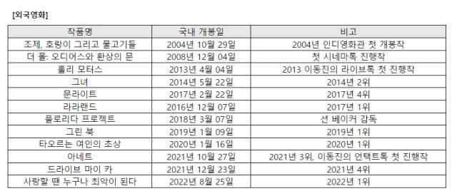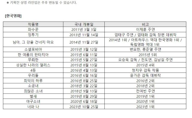 아트하우스에서 많은 사랑을 받았던 작품들도 선보인다. 2014년 개봉해 한국 독립영화 역대 1위를 기록하고 있는 ‘님아, 그 강을 건너지 마오’가 상영된다. 아트하우스 관객수 기준으로 한국영화와 외국영화에서 그해 가장 많은 관객을 모은 ‘벌새’(2019년 1위), ‘야구소녀’(2020년 1위), ‘너와 나’(2023년 1위)를 비롯해 ‘라라랜드’(2017년 1위), ‘그린 북’(2019년 1위)과 ‘타오르는 여인의 초상’(2020년 1위), ‘사랑할 땐 누구나 최악이 된다’(2022년 1위)도 만날 수 있다.
