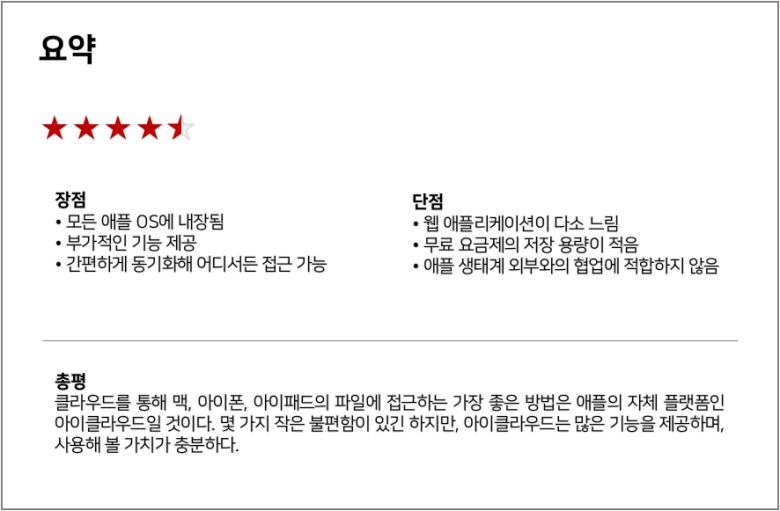 애플 기기만 사용한다면 아이클라우드 드라이브는 당연한 선택이며, 이미 기기에 내장돼 있다. 저장 용량에 대한 비용을 지불해야 하지만 비용 대비 많은 것을 제공하므로 충분히 만족할 것이다. 아이클라우드를 사용하면 모든 기기에서 파일과 사진을 동기화할 수 있지만, 이를 백업 수단으로 생각해 파일을 맥 혹은 다른 기기에서 삭제해도 된다고 생각하지는 말아야 한다.