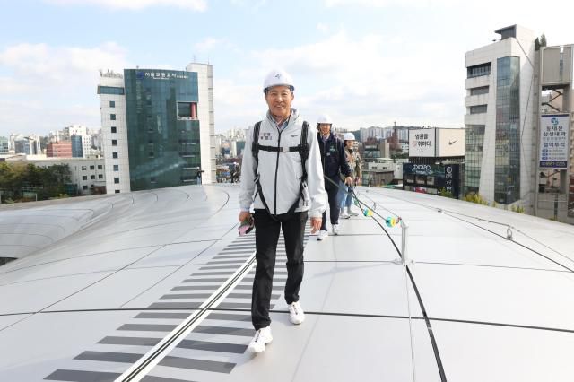 오세훈 서울시장이 23일 오후 서울 중구 동대문디자인플라자(DDP)에서 'DDP 루프탑 투어'를 체험하고 있다. DDP 개관 10주년을 맞아 진행되는 루프탑 투어는 안전로프 몸을 연결하는 장비와 안전모를 착용하고 지붕 위 280m를 30분가량 걸어보는 코스다. 2024.10.23 [사진=연합뉴스, 공동취재] |