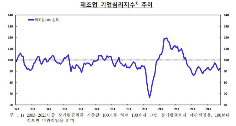 한국은행이 24일 발표한 ‘2024년 10월 기업경기조사 결과 및 경제심리지수(ESI)’에 따르면 이달 전산업 기업심리지수(CBSI)는 92.1로 전월에 비해 0.9포인트 상승했다. 7월(95.1)에 하락 전환한 이후 4개월 만에 상승 전환한 것이다. 제조업CBSI와 비제조업CBSI도 각각 1.7포인트, 0.3포인트 오른 92.6, 91.7로 집계됐다. 제조업CBSI는 4개월 만에, 비제조업CBSI는 3개월 만에 각각 상승 전환했다.