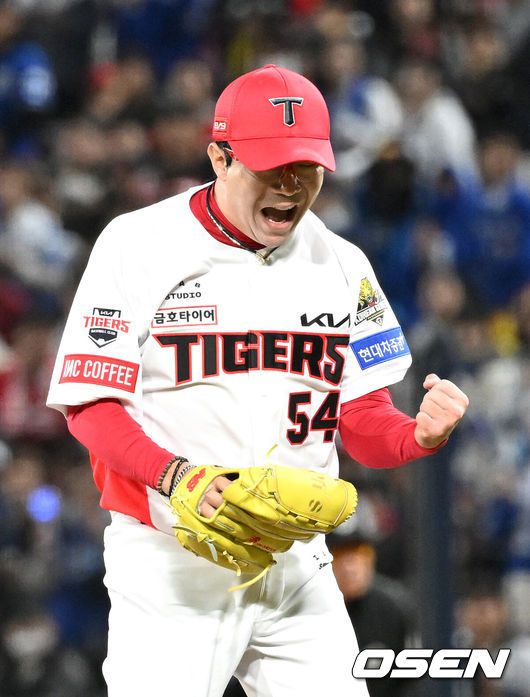 [OSEN=광주, 이대선 기자] 23일 광주 기아챔피언스필드에서 2024 신한 SOL뱅크 KBO 한국시리즈 2차전 KIA 타이거즈와 삼성 라이온즈의 경기가 열렸다.KIA는 양현종, 삼성은 황동재를 선발 투수로 내세웠다.5회초 2사에서 KIA 양현종이 삼성 김영웅을 삼진으로 처리하고 환호하고 있다. 2024.10.23 / sunday@osen.co.kr
