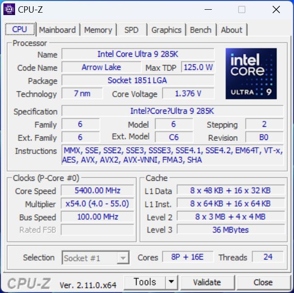 코어 울트라 9 285K는 8개의 P코어와 16개의 E코어로 구성되어 총 스레드 수는 24개다. P코어는 기본 3.7GHz, 맥스 부스트 5.5GHz, 인텔 터보 부스트 맥스 3.0은 5.6GHz, 최대 터보는 5.7GHz로 작동하며, E코어는 기본 3.2GHz, 맥스 터보 4.6GHz로 작동한다. |
