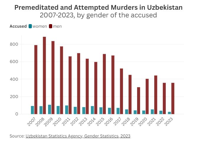 우즈베키스탄 여성의 살인 빈도는 남성과 비교했을 때 현저히 낮다. 지난해 우즈베키스탄 전국 지방 법원에서 1심 사건으로 검토된 살인 사건은 약 300건에 달했지만, 여성은 전체 사건의 7%에 불과했다. 여성 피고인은 총 21명이다.