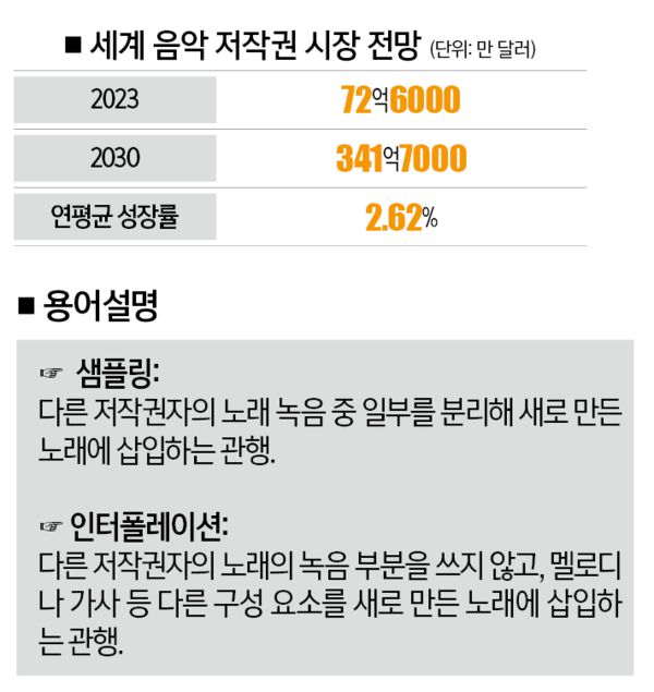그만큼 저작권 시장은 창작자를 위협할 정도로 커지고 있다. 미국 시장조사 회사 베리파이드 마켓 리서치는 음악 저작권 시장 규모가 2021년 이후 연평균 2.62% 이상씩 증가해 2023년 72억6000만 달러, 2030년에는 341억7000만 달러로 늘어날 것으로 전망했다.