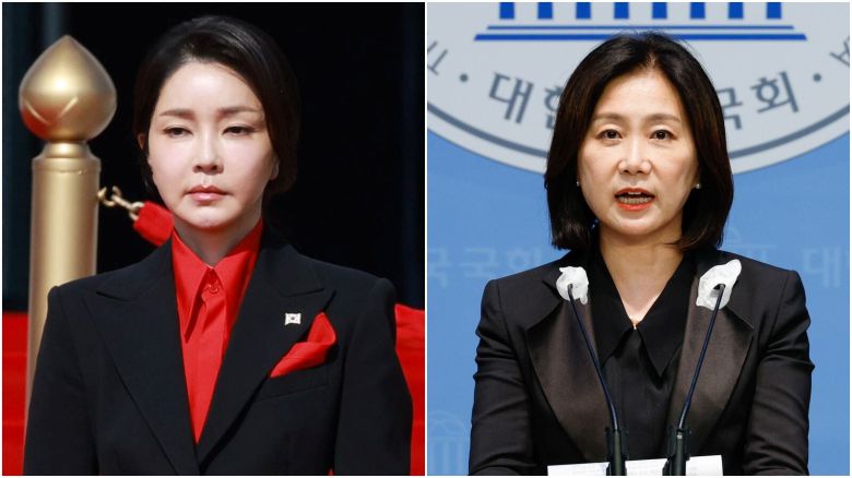 윤석열 대통령 부인 김건희 여사가 24일 서울 용산 대통령실 청사에서 열린 국빈 방한 공식환영식에 안제이 두다 폴란드 대통령 부인 아가타 콘하우저-두다 여사와 자리하고 있다(왼쪽 사진). 허은아 개혁신당 대표가 16일 오후 서울 여의도 국회 소통관에서 운영위원회가 상설특검 규칙안을 야당 단독으로 소위에 회부한 것과 관련, 개혁신당이 특검 추천권을 가져야 한다며 긴급 기자회견을 하고 있다(오른쪽 사진). /뉴시스·뉴스1 |