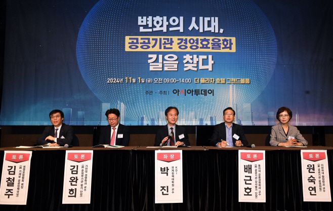 아시아투데이 박성일 기자 = 1일 서울 중구 더 플라자호텔 그랜드볼룸에서 '제2회 아시아투데이 공공기관 포럼'이 열렸다. 좌장 박 진 KDI 국제정책대학원 교수이 공공기관 경영효율성을 주제로 종합토론을 주재하고 있다. 이 자리에는 김완희 가천대 경영학과 교수(前 준정부기관 평가 단장), 김철주 생명보험협회 회장(前 기재부 공공정책국장), 배근호 동의대 금융경영학과 교수(前 공공기관 감사평가 단장), 원숙연 이화여대 행정학과 교수(前 공공기관 운영위원)이 패널로 참석해 토론의 시간을 가졌다. |