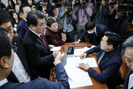1일 국회에서 열린 운영위원회 대통령실 국정감사에서 여당위원들이 박찬대 국회운영의원회 위원장에게 항의하고 있다. 전민규 기자 |