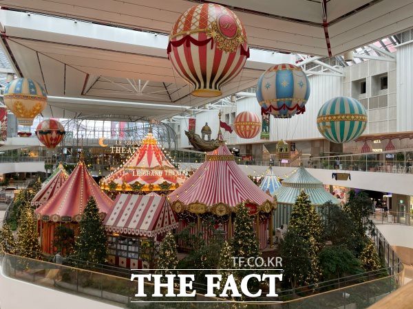 더현대 서울의 경우 신세계나 롯데처럼 건물 외벽을 미디어 파사드로 꾸미는 대신 매장 내부 공간을 할애해 유럽 동화 속 서커스 마을처럼 연출했다. 특히 올해는 '움직이는 대극장'을 주제로 5층에 높이 7m, 너비 5m 정도 열기구 에어벌룬 6개를 띄운다. 크리스마스존으로 구성된 공간 입구에는 티켓 부스와 함께 화려한 벨벳 커튼을 배치시켜 마치 서커스장에 입장하는 듯한 느낌을 준다.