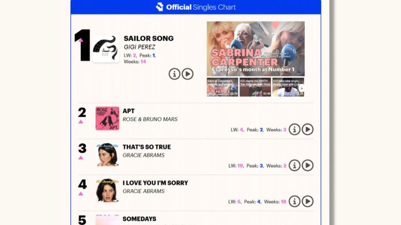 걸그룹 블랙핑크 로제와 팝스타 브루노 마스의 듀엣곡 '아파트'가 영국 오피셜 싱글차트 '톱 100'에서 2위를 차지했습니다.