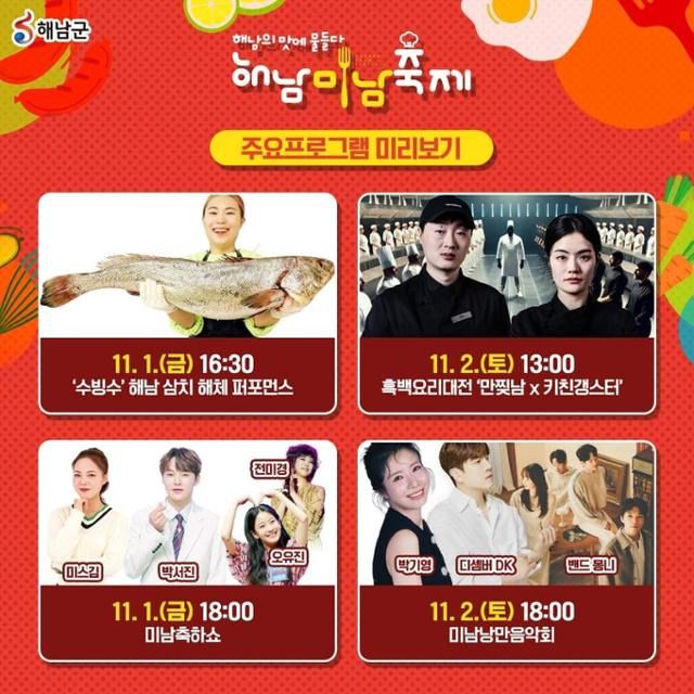 해남에선 1일부터 사흘간 두륜산 도립공원에서 '2024 해남미남(味南)' 축제도 동시에 열린다. 해남의 풍부한 농수특산물과 먹거리를 활용해 '맛있는 해남, 미남 해남'의 맛과 멋을 알리는 행사다.