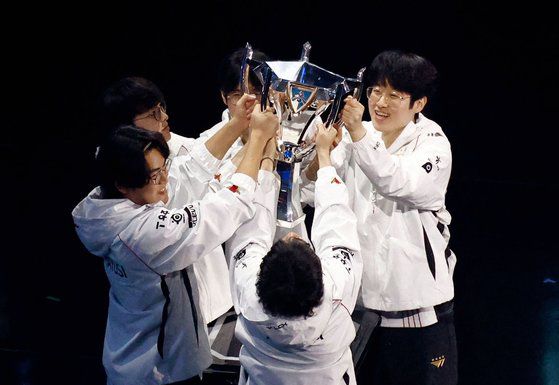 T1이 2일(현지시간) 영국 런던 O2 아레나에서 열린 롤드컵 결승전에서 LPL(중국) 1시드 비리비리 게이밍(BLG)을 상대로 세트 스코어 3대2로 꺾고 5번째 우승을 거머쥐었다. AFP=연합뉴스 |