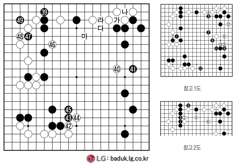 <제4보>(39~49)=박정환은 발군의 수읽기와 실전적 기풍이 돋보인다. 다만 최근엔 집중력이 떨어져 치명적 실수가 가끔 나온다. 시바노 도라마루는 침착하고 두텁게 두면서 자유로운 발상도 종종 보여준다. 39는 좌상귀 침입과 좌우 연결을 보는 공격적인 대응이나 작전의 일관성에서는 감점. 최규병 9단은 전장을 이탈한 한가로운 수라고 꼬집는다. 흑 ’가’부터 부호순으로 백 ’라’까지 선수한 다음 ‘마’로 봉쇄하고 싶다는 것. 우변과 호응한 흑 모양이 입체적으로 변한다. 박정환은 40으로 견제구를 던져 충분하다고 판단한다. 장차 벌어질 중앙전에도 대비하고 있다. 41은 책략 부족. 참고 1도와 같은 기백이 필요했다. 5, 7이 호방한 공격. 우변 실리는 깨졌지만 우하변 일대가 광대해서 AI는 이제부터 승부라고 했다. 46은 무슨 의미일까. 참고 2도를 기대하고 있다. 흑이 좋을 리 없다. 47, 49가 이런 모양에서 상투적 수법이다. 무슨 뜻일까.