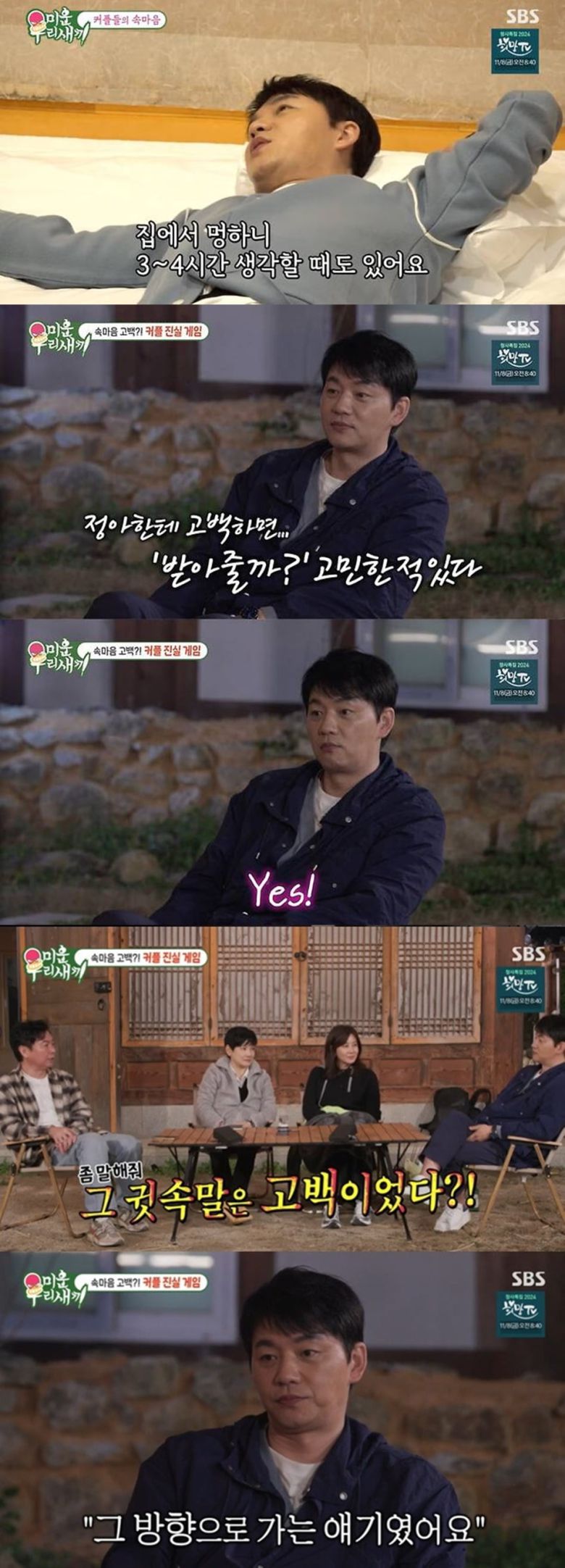 임원희가 “놀이공원 갔을 때인가 귓속말로 뭐라고 한 거냐. 너무 듣고 싶은데 안 들리니까”라며 묻자 김승수는 “안 가르쳐주지”라며 피했다.