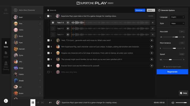 수퍼톤은 지난달 31일 TTS(Text-to-Speech) 기술 기반의 AI 음성 서비스 ‘수퍼톤 플레이’의 오픈 베타 테스트(OBT)도 시작했다. 수퍼톤 플레이는 낸시 기반으로 텍스트를 음성으로 변환하는 TTS 기술을 적용한 AI 음성 서비스다. 50개의 목소리 캐릭터별로 한국어·일본어·영어 등 3개 언어를 지원, 총 150개의 목소리 옵션을 제공한다. 대본에 적합한 목소리를 선택해 1차로 음성을 만든 뒤, 낸시를 활용해 목소리 구성 요소들을 다양하게 조합하면 연출 의도에 최적화된 음성을 구현할 수 있다. 실제 사람의 발화 스타일은 물론, 감성 정보까지 학습시켜 자연스러운 목소리를 생성하는 수퍼톤 고유의 TTS 기술이 기반이 되어 풍부한 감정 표현까지 가능하다.