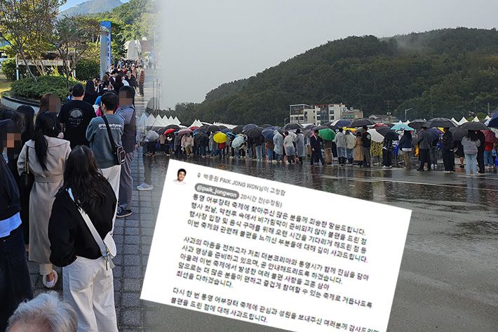 그는 "통영 어부장터 축제에 찾아주신 많은 분들께 죄송한 말씀드립니다"라고 운을 뗐다. 이어 "행사 첫날 악천후 속에서 비가림막이 준비되지 않아 불편을 드린 점, 행사장 입장 및 음식 구매를 위해 오랜 시간을 기다리게 해 드린 점 등 이번 축제와 관련해 불편을 느끼신 부분들에 대해 깊이 사과드린다"고 전했다.