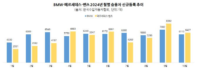 하지만 연간 기준으로는 BMW가 메르세데스-벤츠를 앞서고 있다. 1~10월 BMW 신규등록 대수는 총 6만585대로 메르세데스-벤츠(5만4475대)보다 6110대 많다.