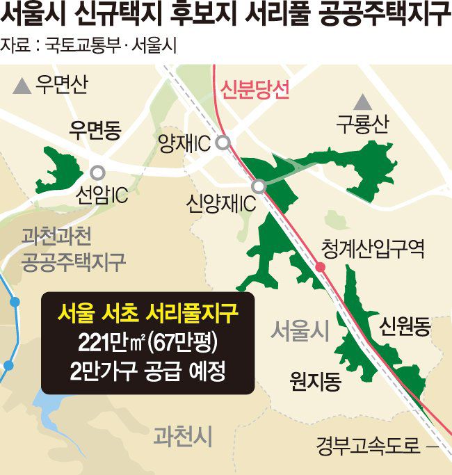 먼저 서울은 선호도가 높은 강남 생활권인 서초 서리풀지구에서 2만가구를 공급한다. 서울 서초구 원지동, 신원동, 염곡동, 내곡동, 우면동 일원 221만㎡ 규모로 강남 도심인 강남역에서 5㎞ 이내 지역이다. 신분당선 청계산입구역과 GTX-C 양재역 등이 위치하며 경기 성남시, 과천시 경계와 접한 곳이다.