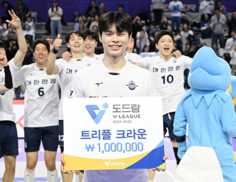 또 정한용은 백어택 5개·블로킹 3개·서브득점 4개로 지난해 11월 11일 개인 통산 첫 트리플크라운을 달성한 뒤 정확히 360일 만에 2번째 트리플크라운을 만들었다. 이날도 상대팀은 KB손해보험(2라운드 의정부, 백어택 4개·블로킹 3개·서브 득점 6개)이었다.