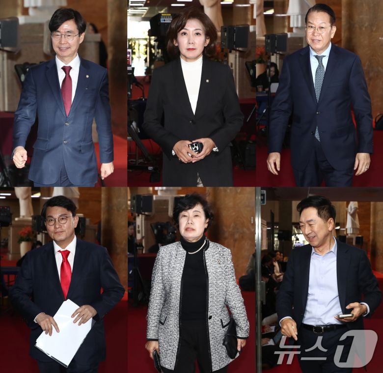 (서울=뉴스1) 이광호 기자 = 국민의힘 중진 5·6선 의원들이 6일 오후 서울 여의도 국회에서 한동훈 대표와 회동을 하기 위해 당대표실로 향하고 있다. 왼쪽 위부터 시계방향으로 조경태, 나경원, 권영세, 김기현, 조배숙, 윤상현 의원.2024.11.6/뉴스1