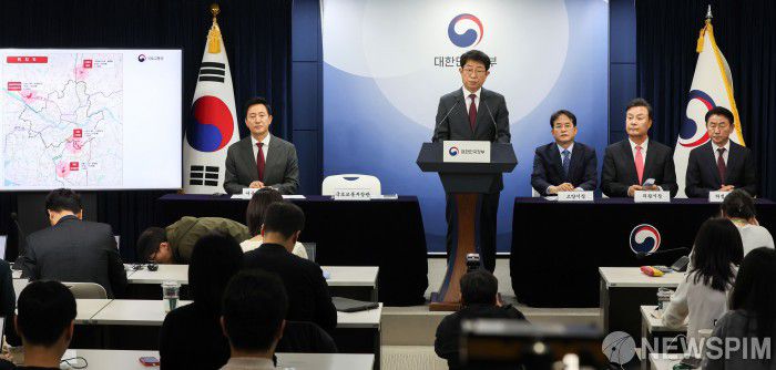 [서울=뉴스핌] 김학선 기자 = 박상우 국토교통부 장관이 5일 정부서울청사에서 서울·고양·의왕·의정부시장과 함께 수도권 신규택지 관련 합동브리핑을 하고 있다. 2024.11.05 yooksa@newspim.com |