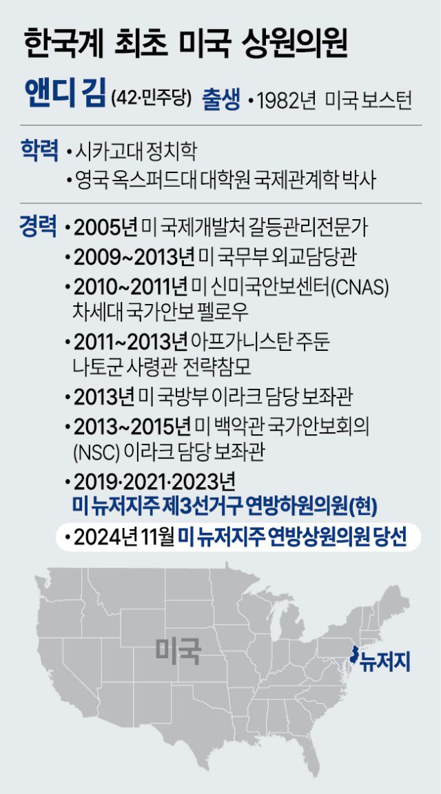 5일(현지 시간) 한국계 최초 상원의원으로 당선된 앤디 김 의원은 당선 소식이 전해진 직후 뉴저지주 체리힐 더블트리호텔에서 가진 기념행사에서 “한국과 미국의 관계를 굳건히 다지고 싶다”며 이같이 포부를 밝혔다. 그는 “한미 관계는 안보와 군사적인 측면에서도 강해야 하지만 경제적인 측면도 강화해야 한다”며 “반도체와 인공지능(AI), 이 밖에 한국이 최전선에 있는 다른 분야에서 우리가 함께할 수 있는 일이 훨씬 많다”고 강조했다.