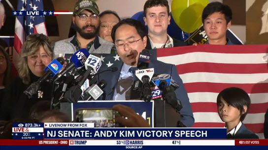 미국 뉴저지주 연방 하원의원인 앤디 김이 5일(현지시간) 연방 상원의원 선거에서 승리한 뒤 축하를 받으며 소감을 밝히고 있다. (사진=폭스뉴스 캡처) |