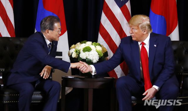 [뉴욕=뉴시스]전신 기자 = 문재인 전 대통령이 2019년 9월23일(현지시간) 뉴욕 인터콘티넨탈 뉴욕 바클레이 호텔에서 열린 한미 정상회담에서 도널드 트럼프 당시 미국 대통령과 악수하고 있다. 2019.09.24. photo1006@newsis.com |
