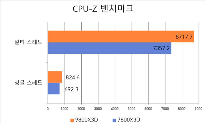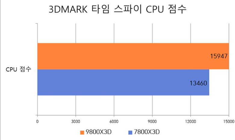 프로세서와 그래픽카드 성능을 종합적으로 확인하는 3DMARK에서 '타임 스파이(Time Spy)' 벤치마크의 CPU 점수는 9800X3D가 7800X3D와 비교해 18.48% 앞섰다.