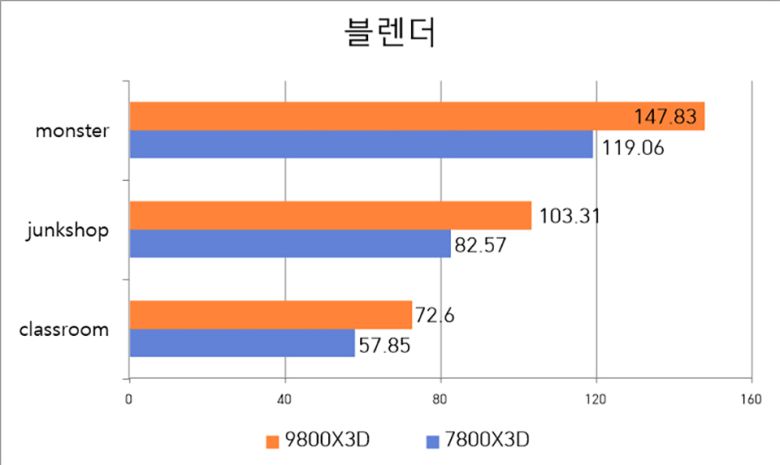 블렌더(Blender) 벤치마크에서도 9800X3D가 7800X3D보다 높은 점수를 기록했다. 몬스터(monster) 항목은 약 24%, 정크샵(junkshop) 항목은 약 25%, 클래스룸(classroom) 항목은 약 25.5% 앞서서 큰 격차를 보였다.