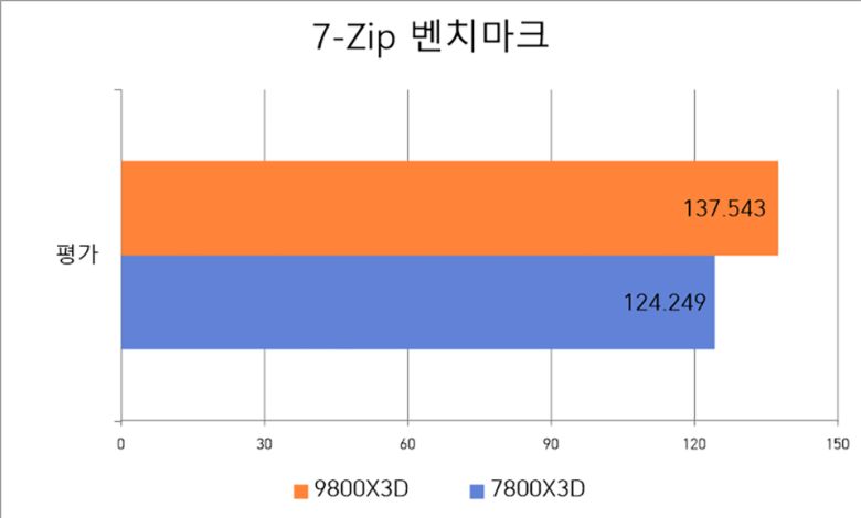 데이터 압축 및 압축 풀기 성능을 측정하는 7-Zip 벤치마크에서는 9800X3D가 7800X3D보다 종합 평가 기준으로 10.7% 높은 성능을 보여주었다.