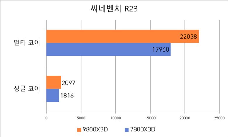 씨네벤치 R23(CINEBENCH R23) 벤치마크에서는 9800X3D가 7800X3D보다 멀티 코어 성능에서 22.71% 앞섰고, 싱글 코어 성능은 15.47% 높았다.