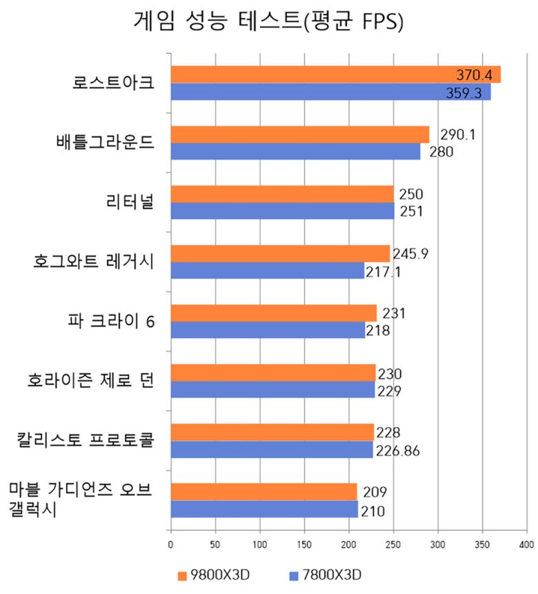 테스트 결과 9800X3D는 로스트아크, 배틀그라운드, 호그와트 레거시, 파 크라이 6 등 네 가지 게임에서 7800X3D보다 평균 FPS가 10프레임 이상 높게 측정되었다. 작게는 약 3.5%, 크게는 약 13%까지 격차를 보여서 9800X3D가 확실히 우세한 모습을 보였다.