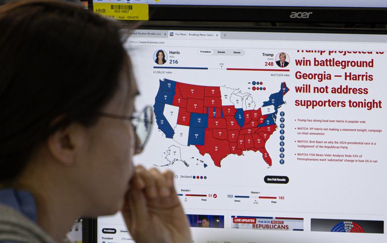 제47대 미국 대통령 선거 개표가 진행되고 있는 6일 오후 서울 중구 하나은행 본점 딜링룸 에서 딜러들이 개표 상황을 주시하며 업무를 보고 있다. /뉴스1 |