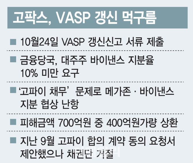 그러나 채권단에서는 고팍스의 제안을 거절했다. 과거 기준이 아닌 현재 시세로 고파이 채무를 상환해줄 것을 요구하고 있다. 업계에서는 심사 기간 동안 고파이 채권단과의 협상을 마무리 짓지 못할 경우 금융당국에서 VASP 갱신신고를 수리해주지 않을 수 있다는 우려가 나온다. 최악의 경우 영업종료도 가능한 상황이라는 의미다.
