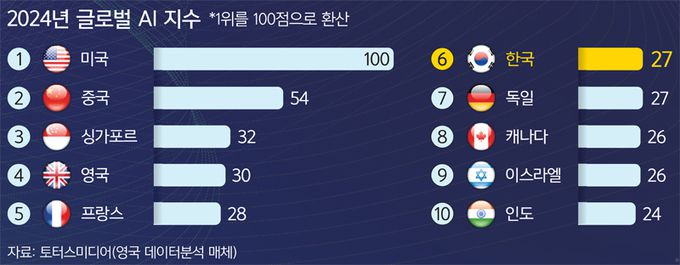 최근 수년간 다양한 기관이 발표한 국가별 AI 지수에서 한국은 세계 10위 안에 무난히 안착해왔다. 인프라와 정부 정책에 가중치를 두는 ‘AI 준비도 지수’(옥스퍼드 인사이트) 7위(2023년), 각국의 AI 역량을 종합적으로 평가하는 ‘글로벌 AI 지수’(토터스 미디어)는 6위(2024년)를 기록했다.